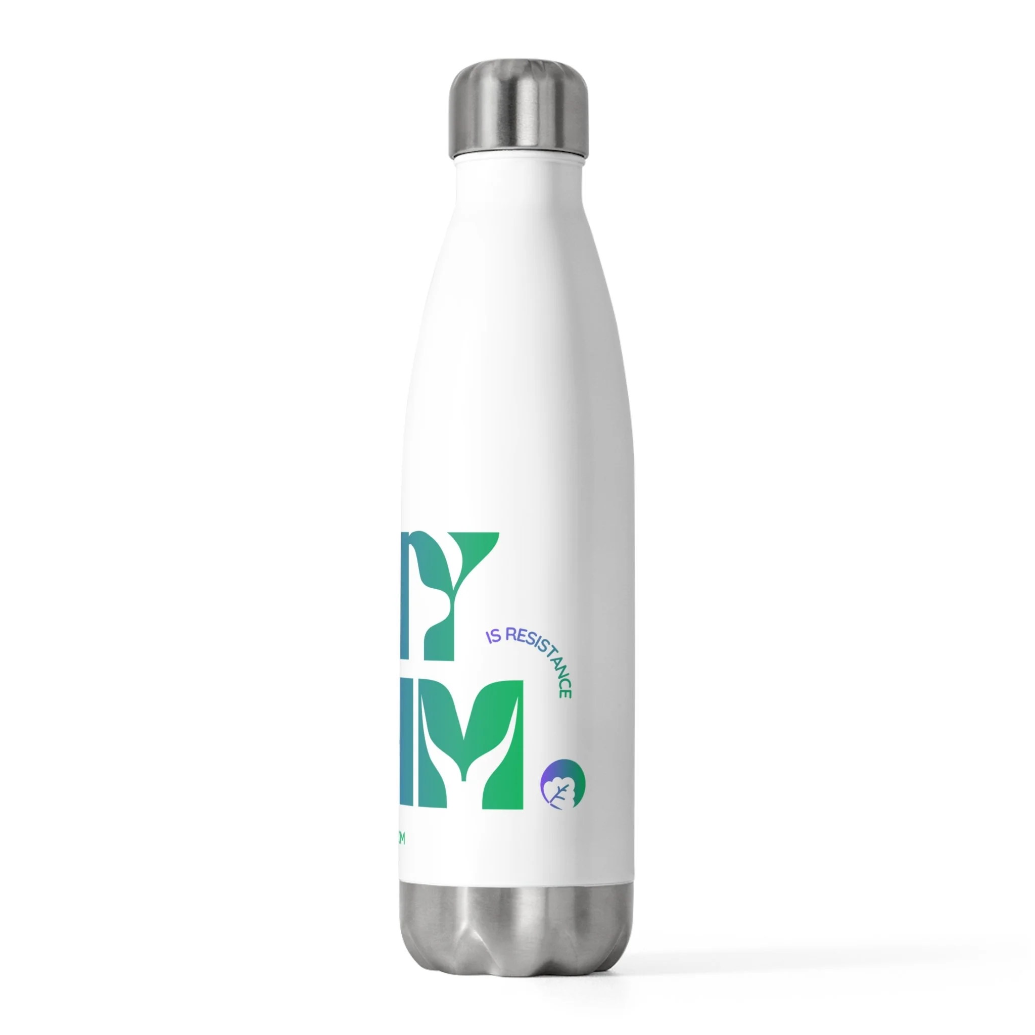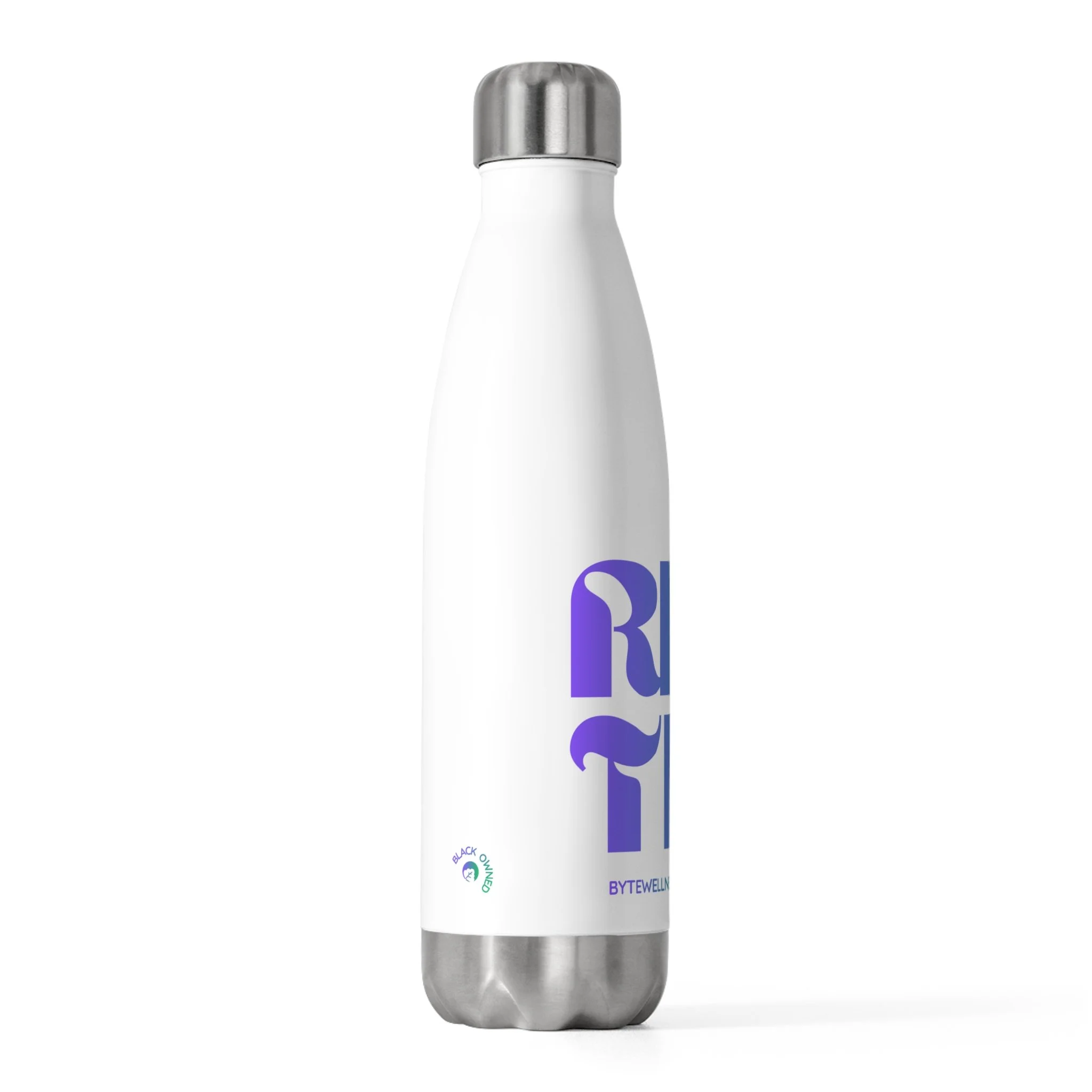 Stay hydrated before and after your workouts with this 20 oz insulated bottle that wraps cold mornings and long commutes in quiet confidence. The matte white steel is stamped with bold, modern typography that peeks around the curve—subtle, graphic, and built to travel. Double-wall insulation keeps drinks cold for hours and holds warmth when you need it. The screw-on stainless top with a silicone seal locks in temperature and prevents spills, so it lives easily in backpacks, bike cages, and office cup holders. It’s lightweight enough to carry all day, tough enough to resist rust and staining, and free from BPA for clean, neutral taste. Bring it along to studio sessions, city walks, or desk-side rituals—this bottle settles into your routine and makes hydration feel intentional.